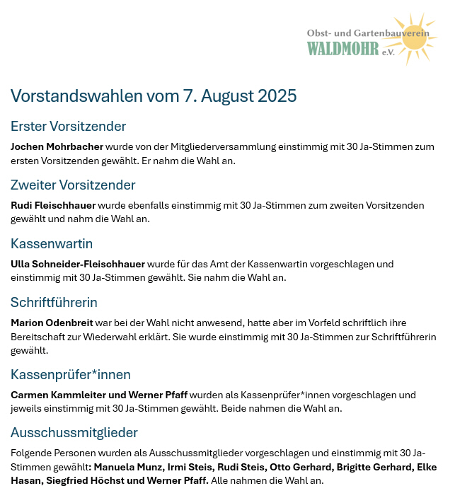 Die Wahlen finden am 7.8.2025 um 19:00 Uhr im Festsaal des Bürgerhauses Waldmohr